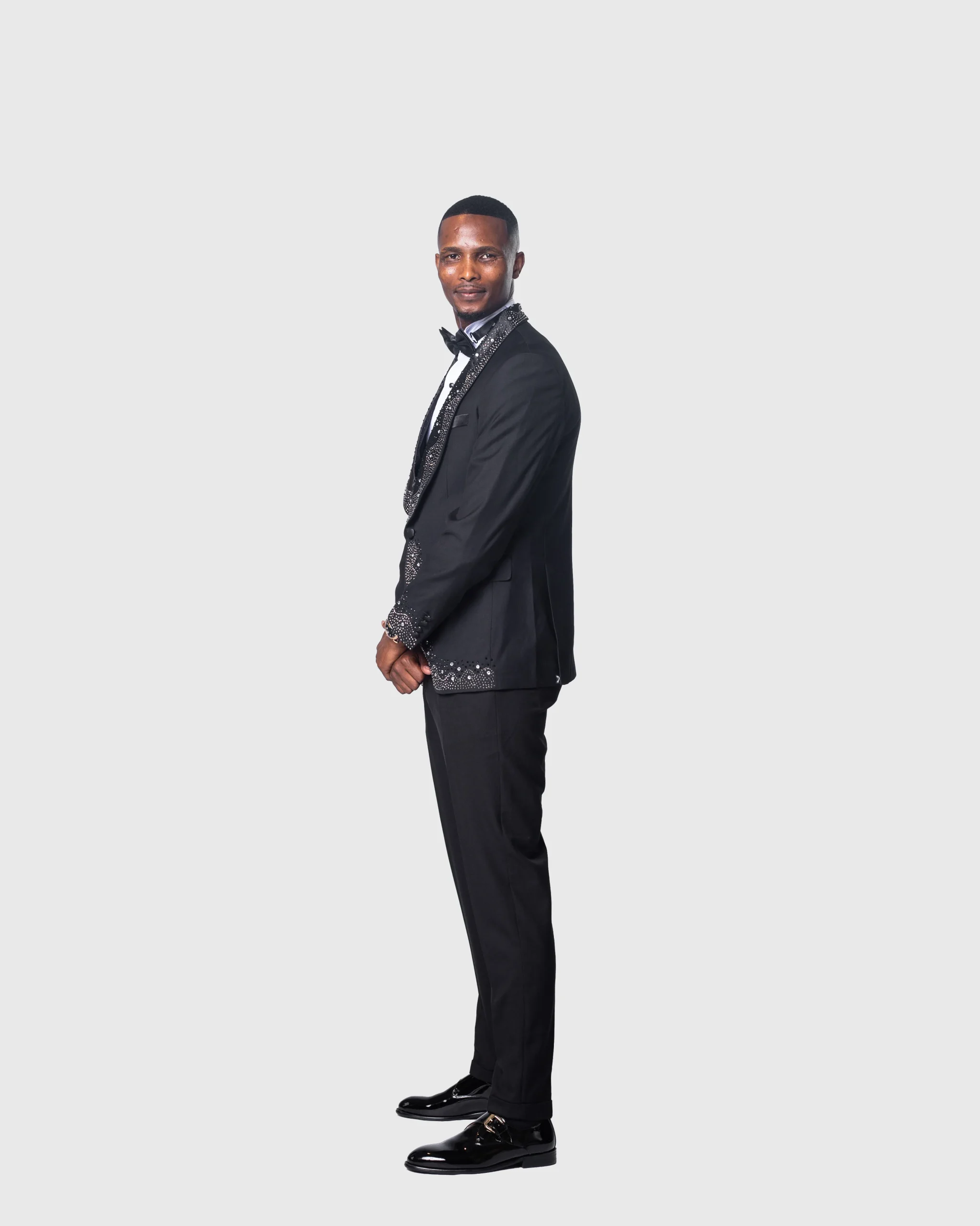 Elevate your formal style with the Daro-Jet Black Shawl Lapel Tuxedo, featuring stunning satin shawl lapels adorned with crystal beading and a chic waistcoat to complete your look.